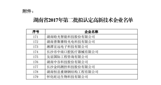 2017年12月1日,湖南省高新技術(shù)企業(yè)認(rèn)定管理工作網(wǎng)公布了關(guān)于公示湖南省2017年第二批擬認(rèn)定高新技術(shù)企業(yè)名單的通知,湖南晗光智能科技股份有限公司位列其中。